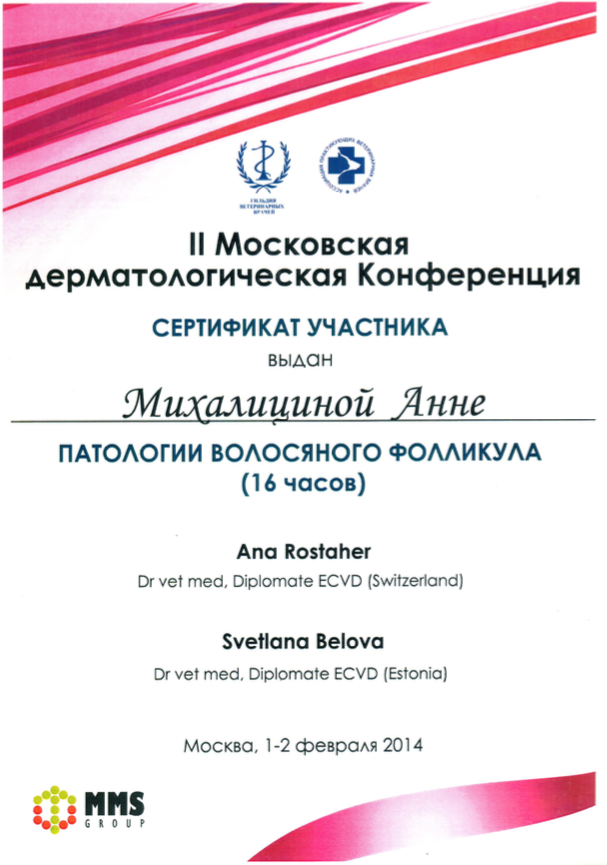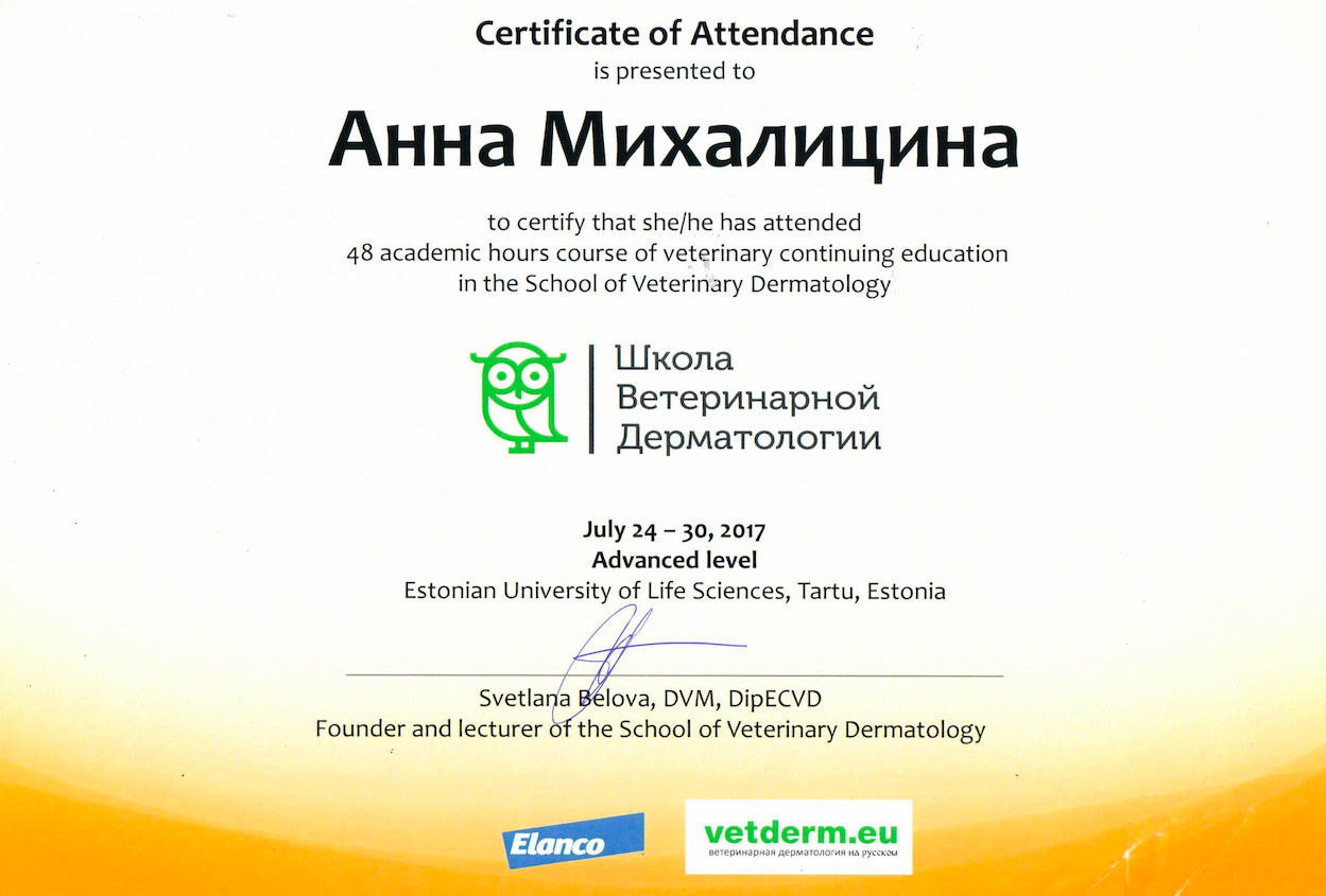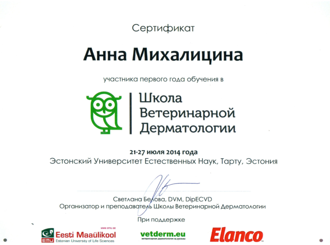 Июль 2014 г. — школа ветеринарной дерматологии (1 уровень) С.А. Беловой, Тарту, Эстония.