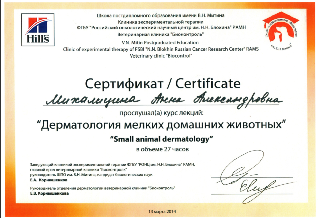 Январь-март 2014 г. — курс лекций «Дерматология мелких домашних животных», ветеринарная клиника «Биоконтроль»