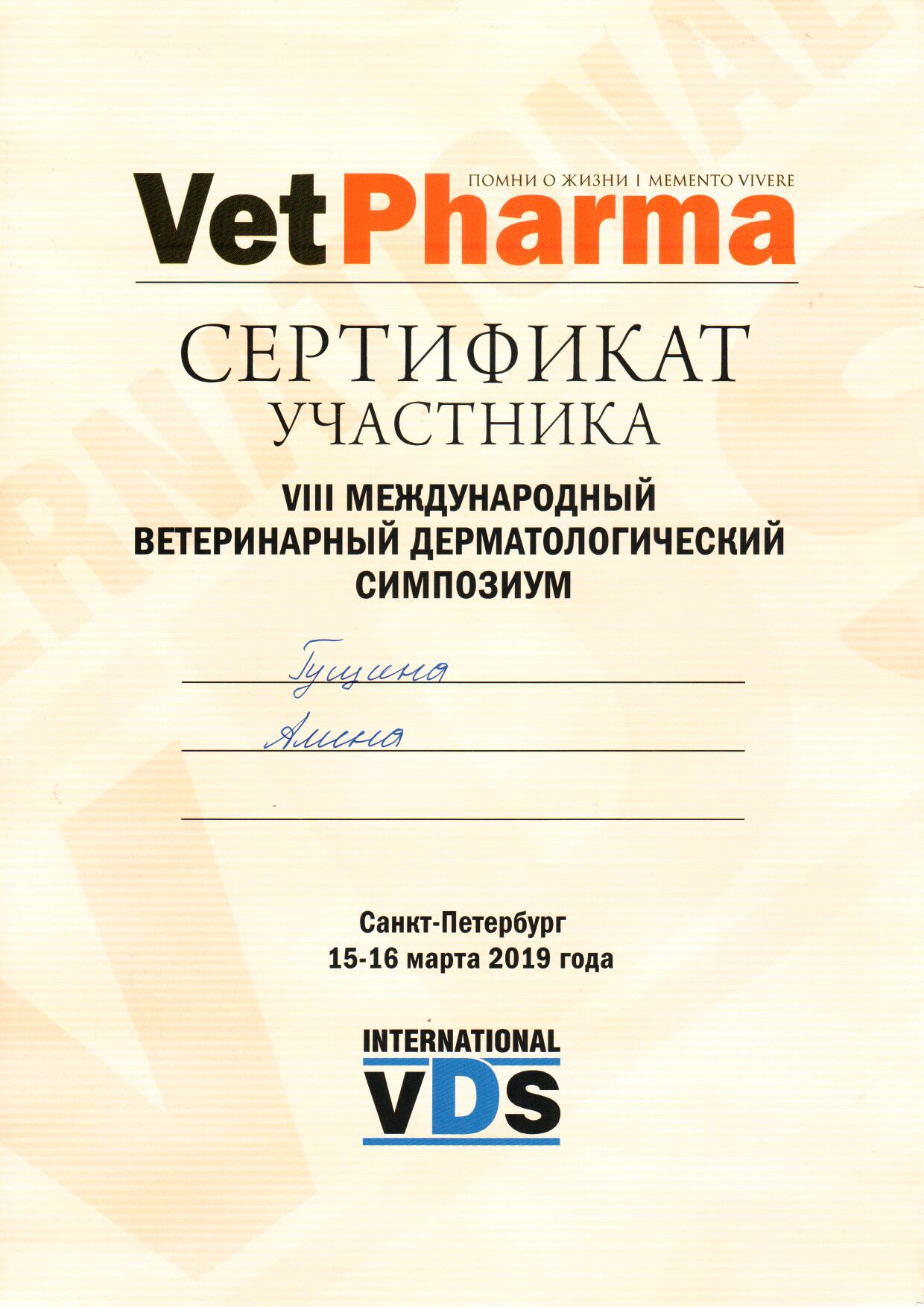 2017−2019 гг. — окончила 2 ступени Школы Ветеринарной дерматологии. Эстония, Тарту
