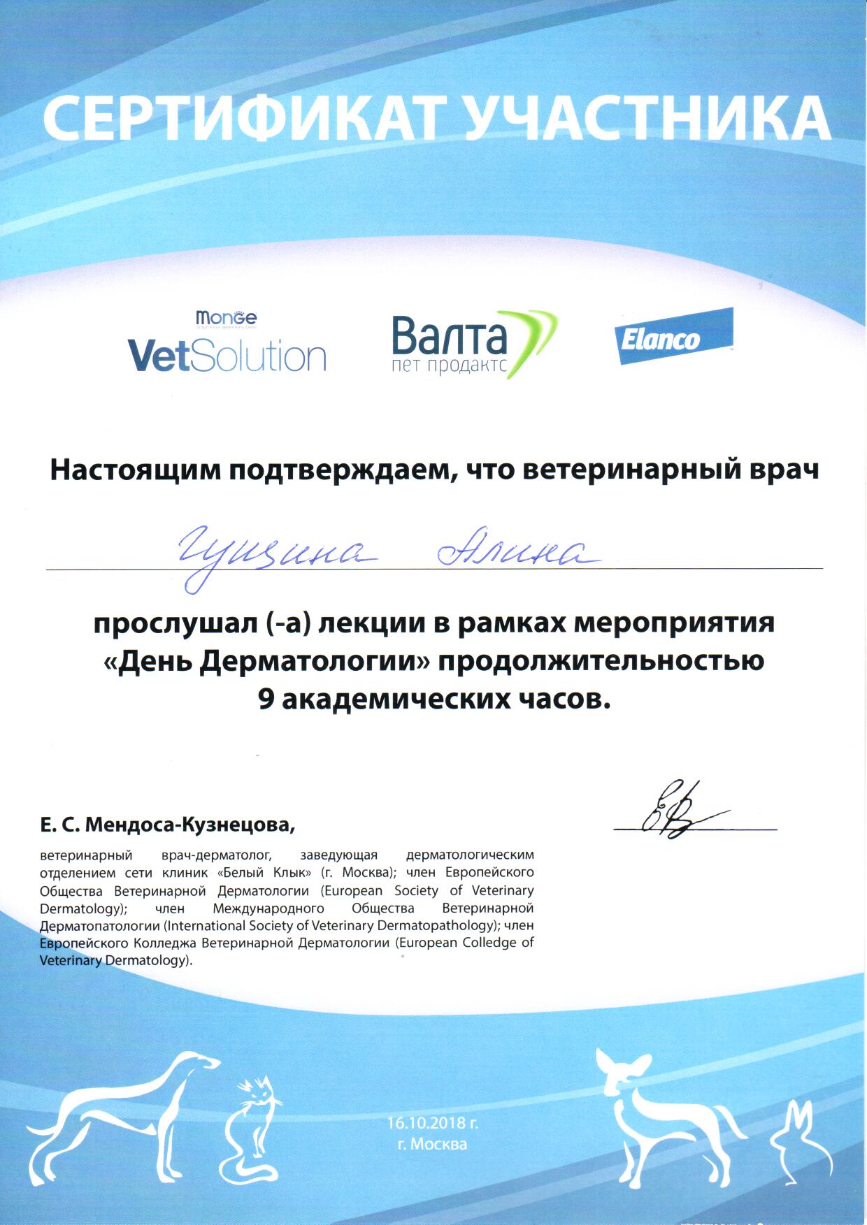 2020 г. — окончила «Курс клинической эндокринологии собак и кошек» на базе Образовательного центра Коллегии ветеринарных специалистов