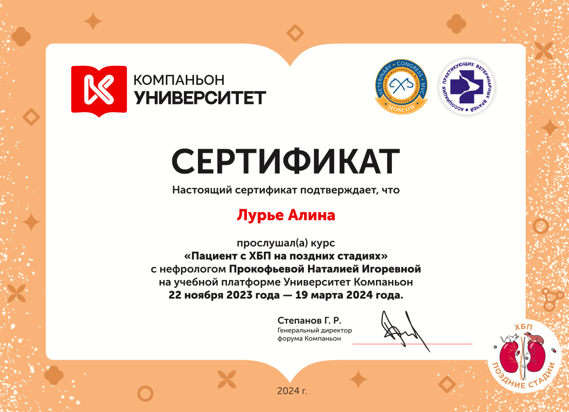 2024 г. — онлайн-курс «Пациент с ХБП на поздних стадиях» на учебной платформе Университет Компаньон
