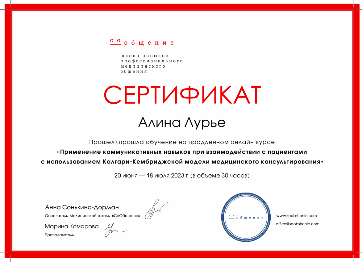 2023 г. — обучение на онлайн курсе «Применение коммуникативных навыков при взаимодействии с пациентами с использованием Калгари-Кембриджской модели медицинского консультирования»