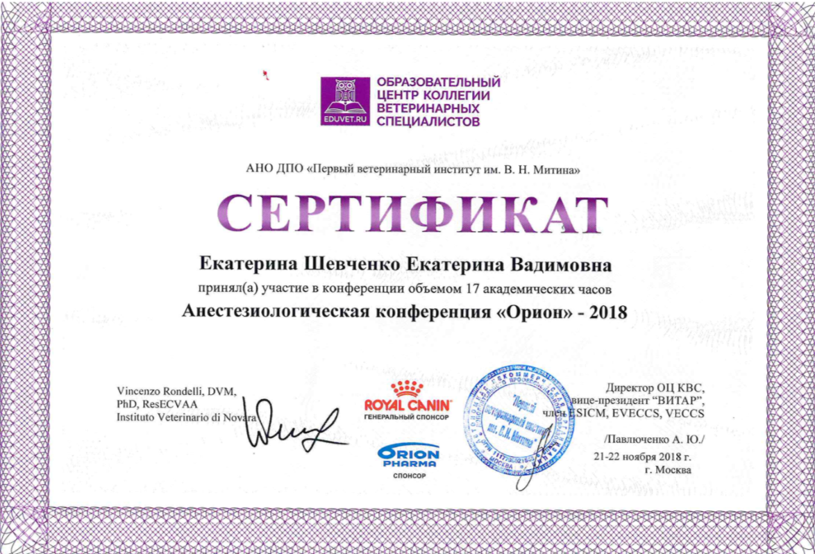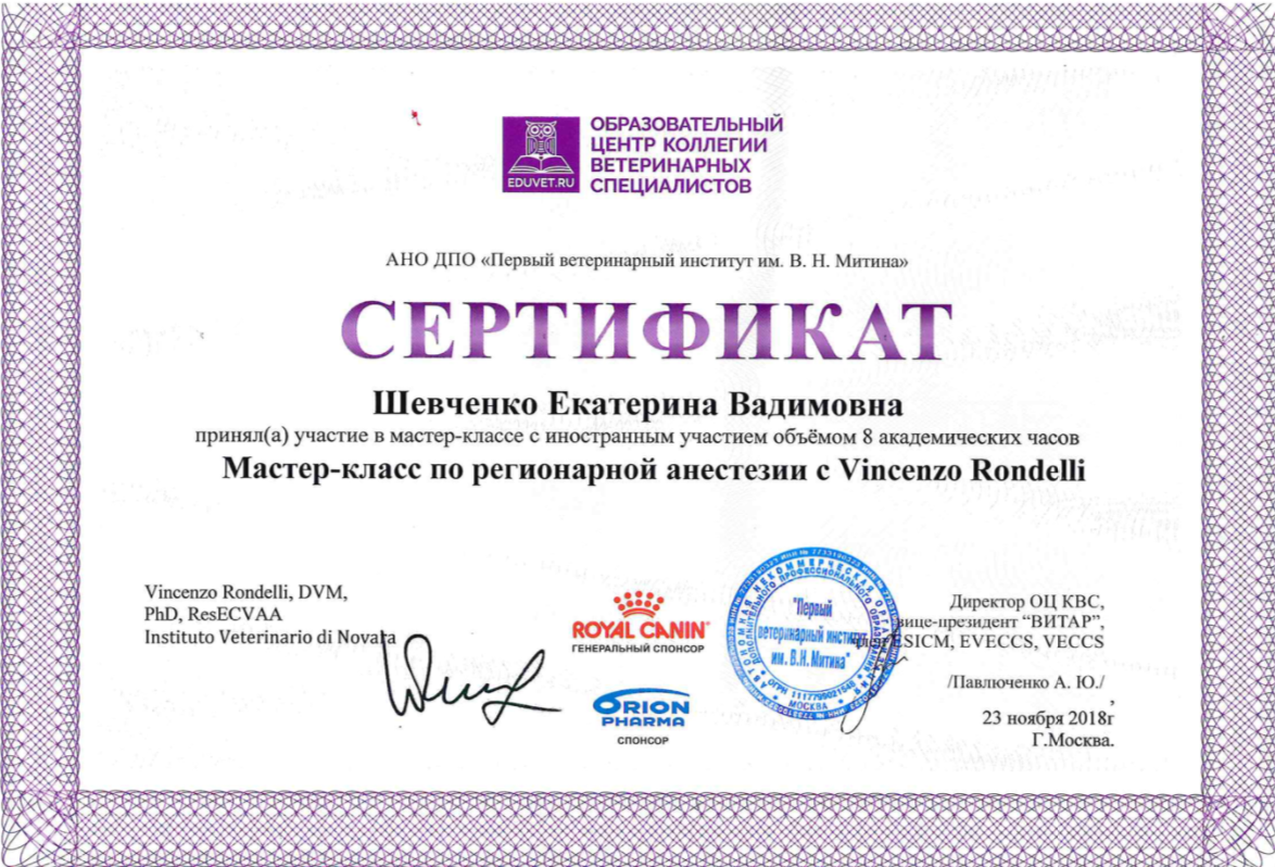 2018 г. — мастер-класс по регионарной анестезии с Винченцио Рондели при Коллегии ветеринарных специалистов.