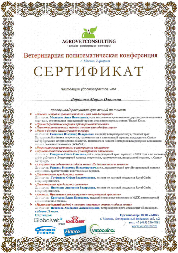 Регулярно посещает семинары и конгрессы по ветеринарии