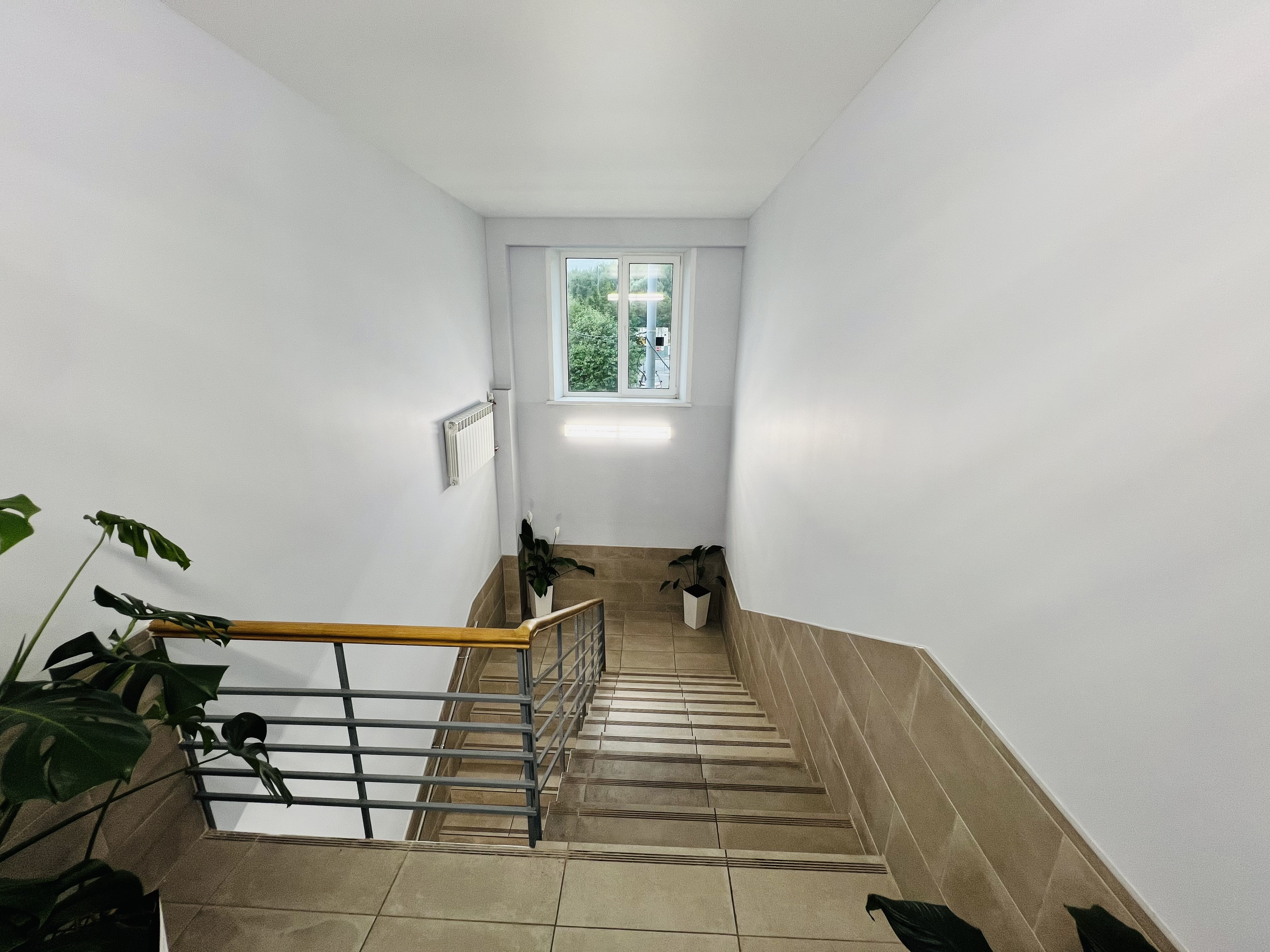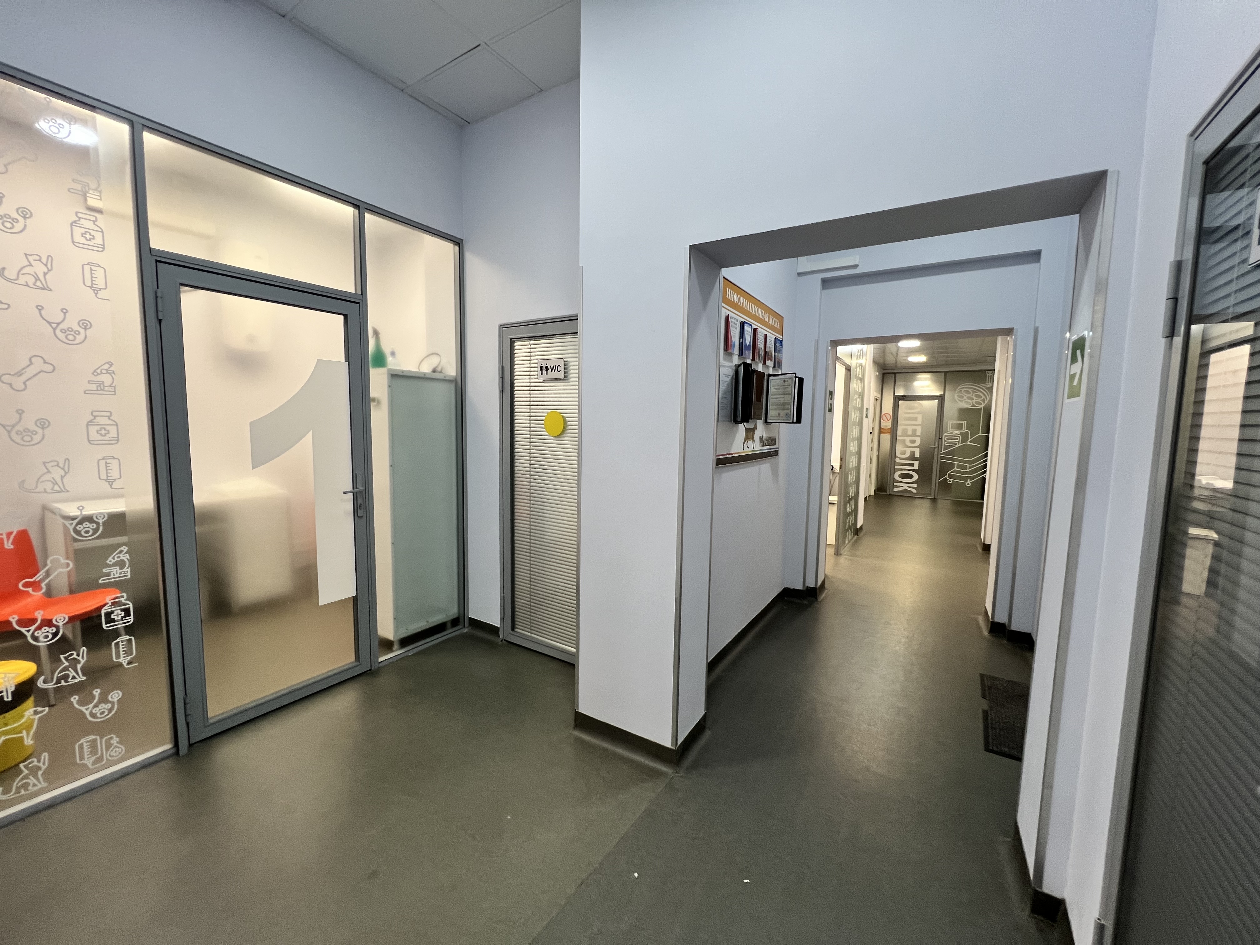 На территории отдельностоящее здание Ветеринарного центра. Вход слева здания со стороны парка.