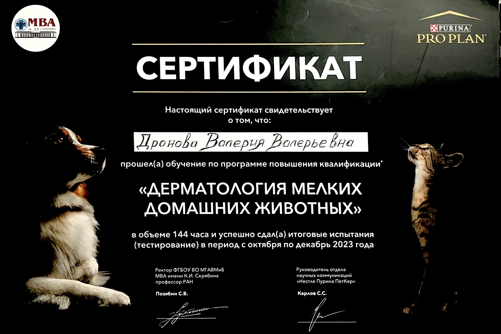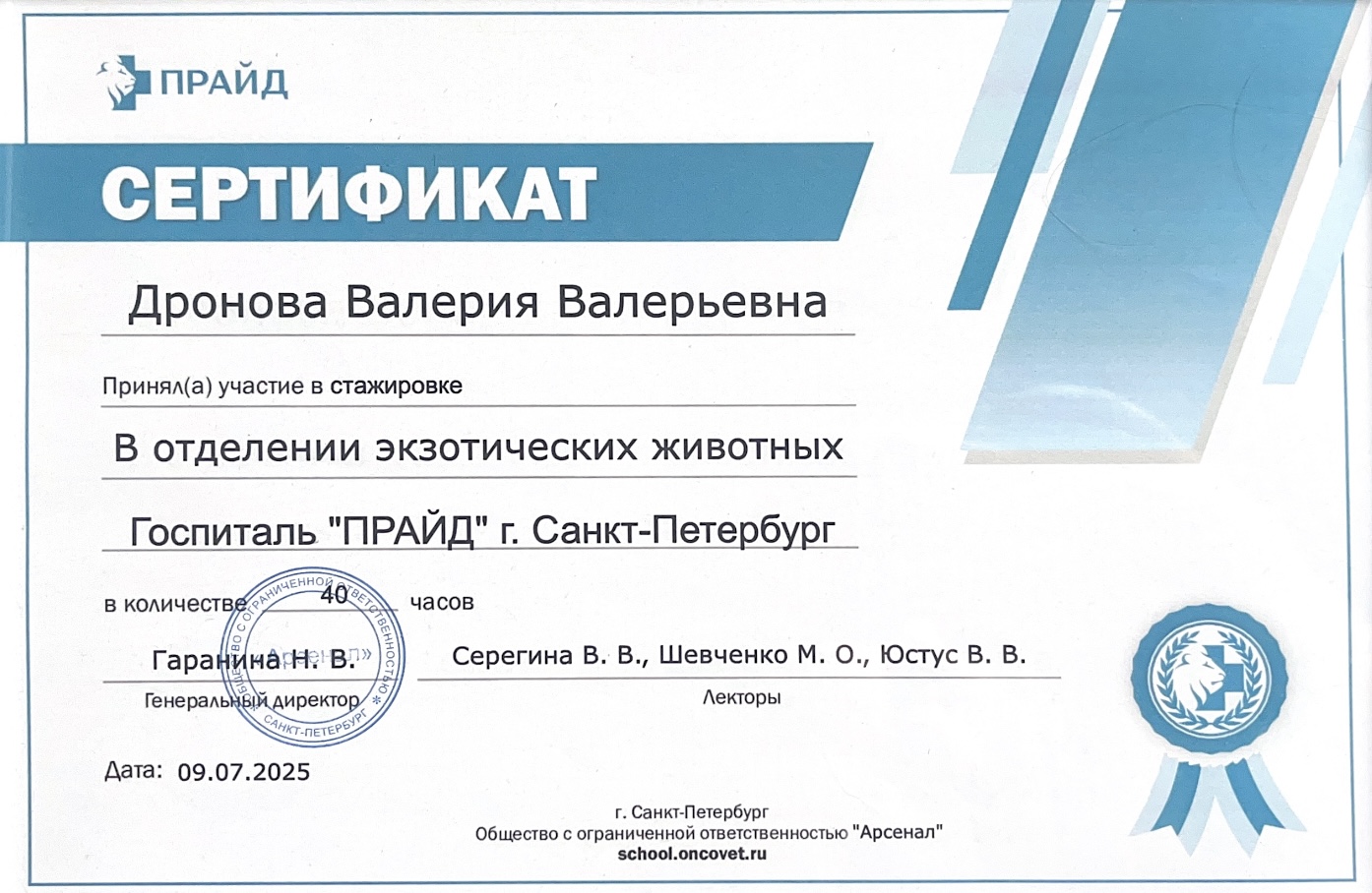 2021 г. — стажировка в отделении ОРиТ в ветеринарном центре «ЛДВЦ-МВА» 2023 г. — Ветеринарный центр «ЛДВЦ-МВА» курсы повышения квалификации «Дерматология мелких домашних животных» 2024 г. — онлайн-курс вебинарнов на тему «Экзотический пациент в стационаре» 2025 г. — Сеть Ветеринарных Центров «МЕДВЕТ» Курсы повышения квалификации «Нефрология и Гастроэнтерология мелких домашних животных» 2025 г. — Курс лекций «Терапия VS хирургия» WebExoVet 2025 г. — стажировка в отделении по работе с экзотическими животными в Госпитале «Прайд» г. Санкт-Петербург