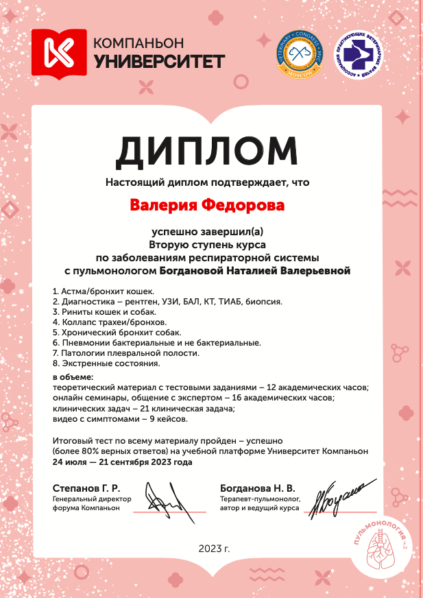 2023 г. — Вторая ступень курса по заболеваниям респираторной системы с пульмонологом Богдановой Наталией Валерьевной