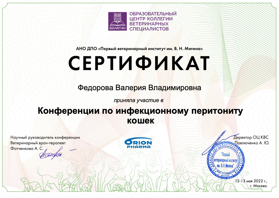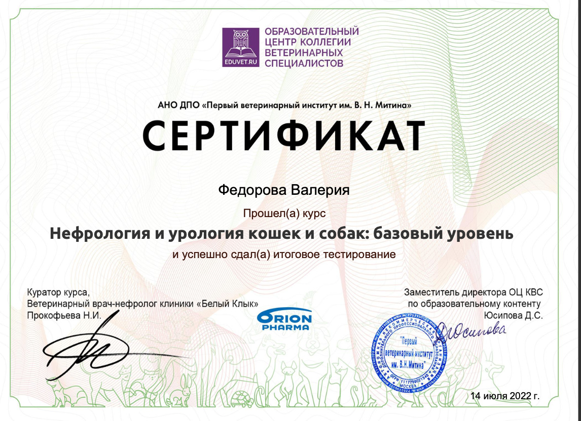 2021 г. — Курс обучения на тему «Правильное питание собак и кошек» от Royal Canin, специализация диетолог-нутрициолог.