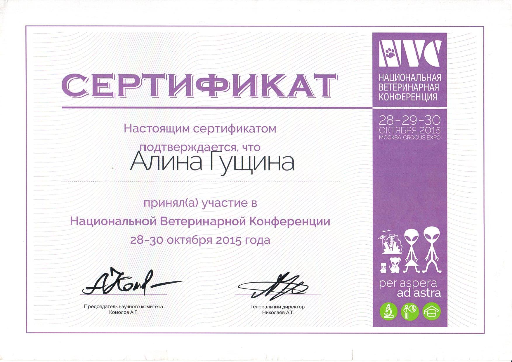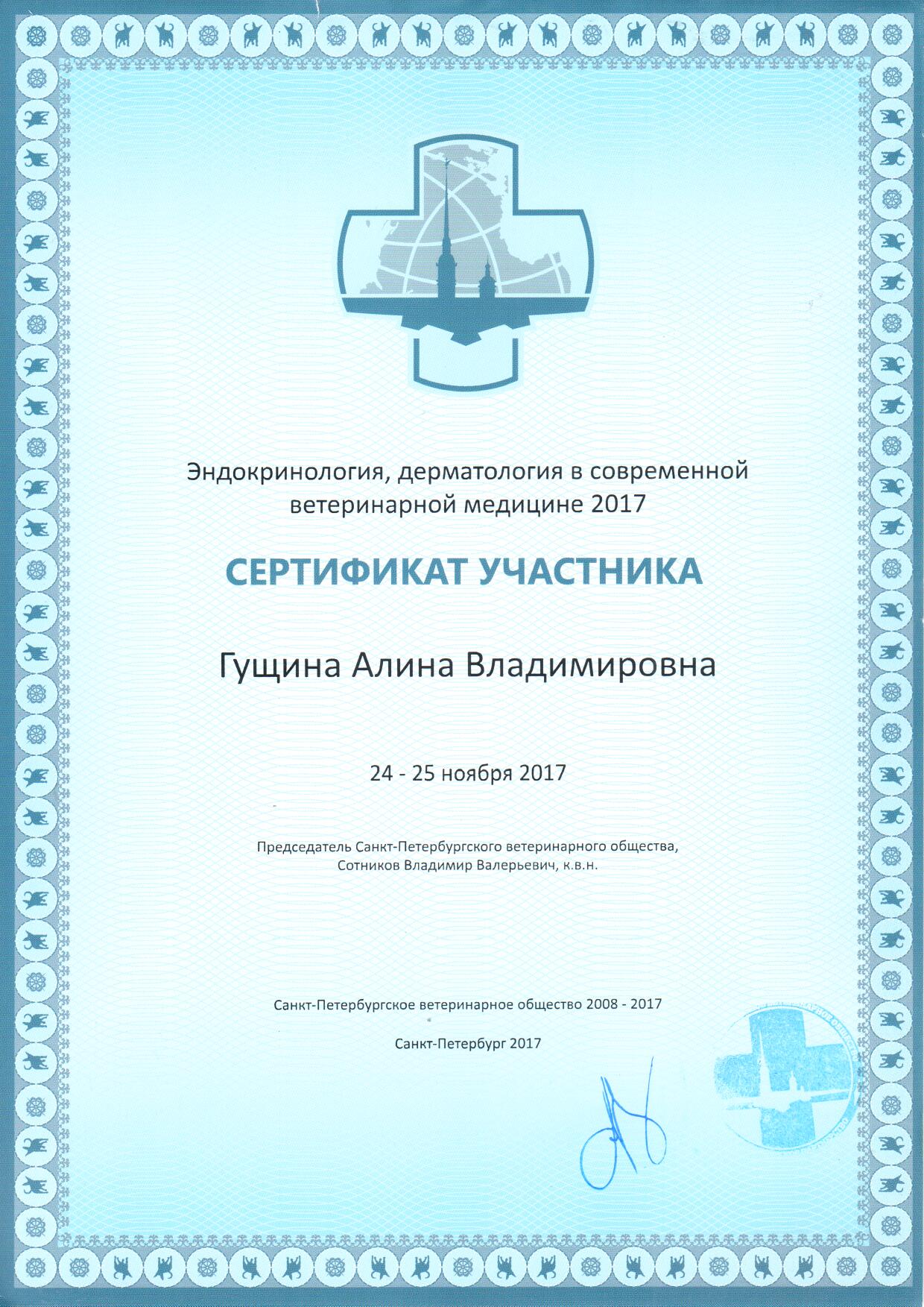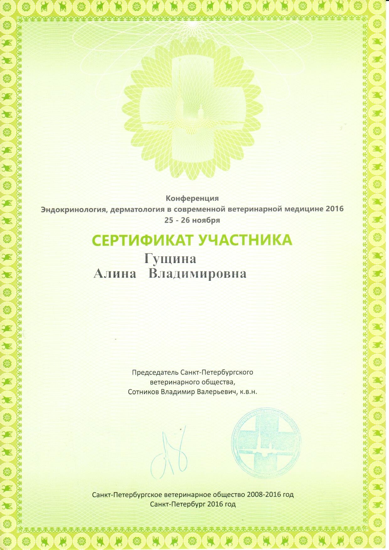 2020 г. — окончила «Курс клинической эндокринологии собак и кошек» на базе Образовательного центра Коллегии ветеринарных специалистов