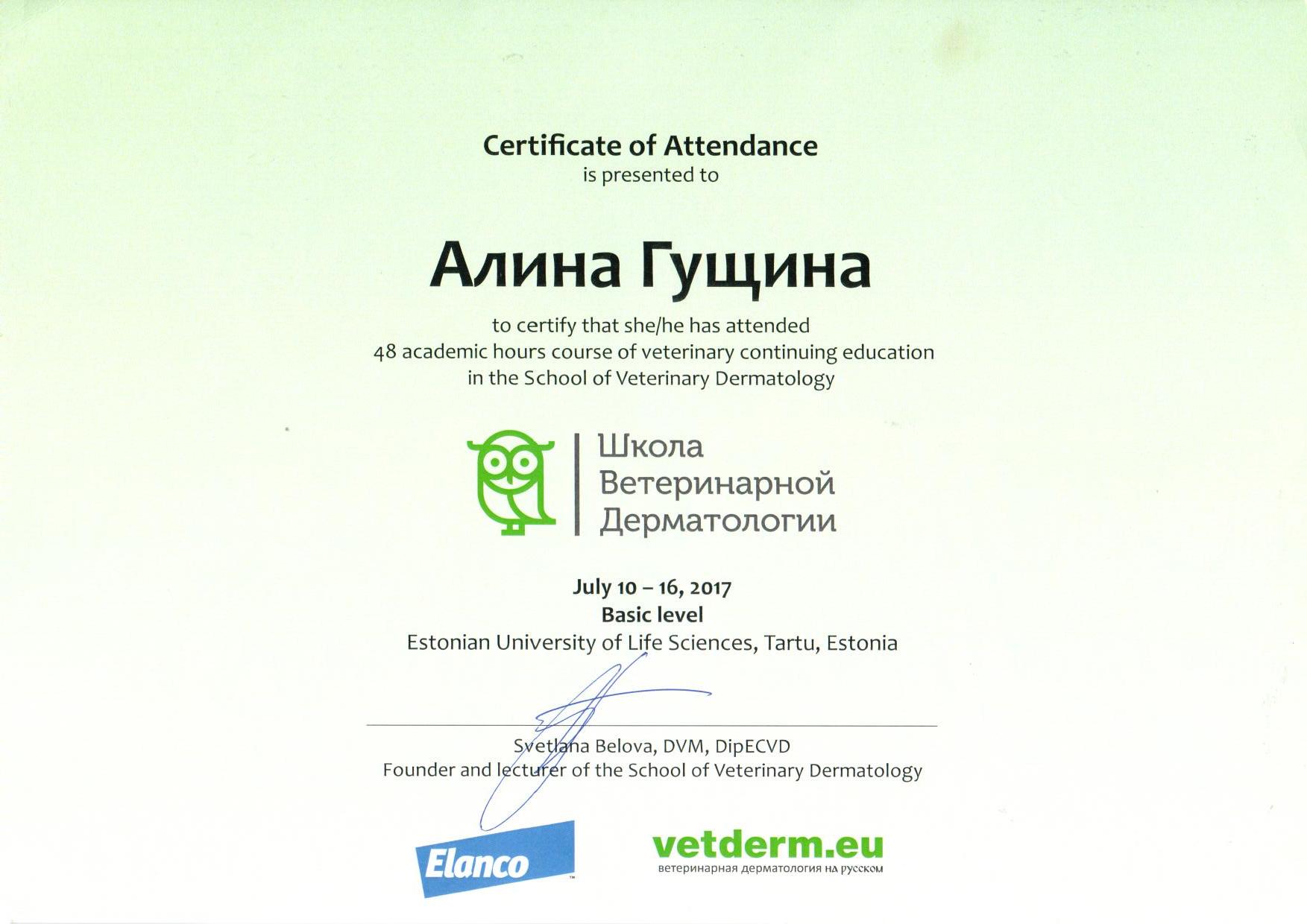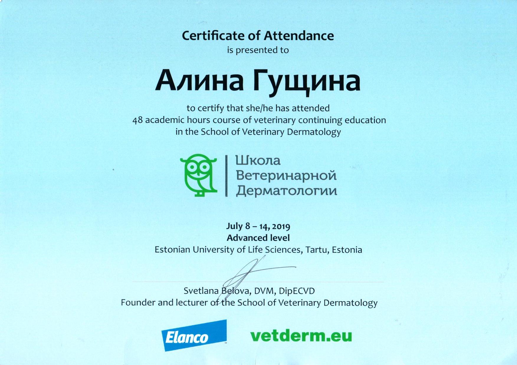 2017−2019 гг. — окончила 2 ступени Школы Ветеринарной дерматологии. Эстония, Тарту