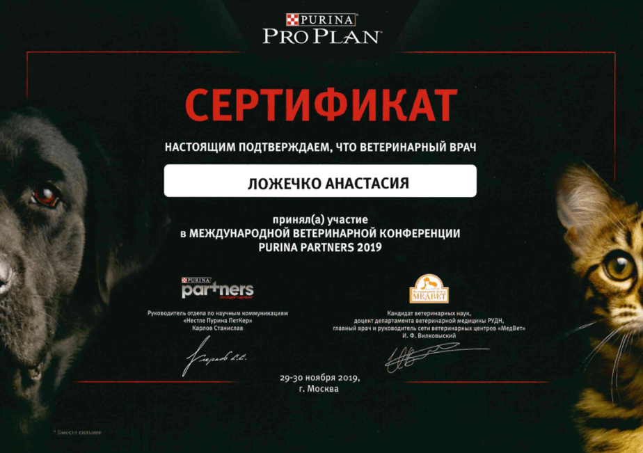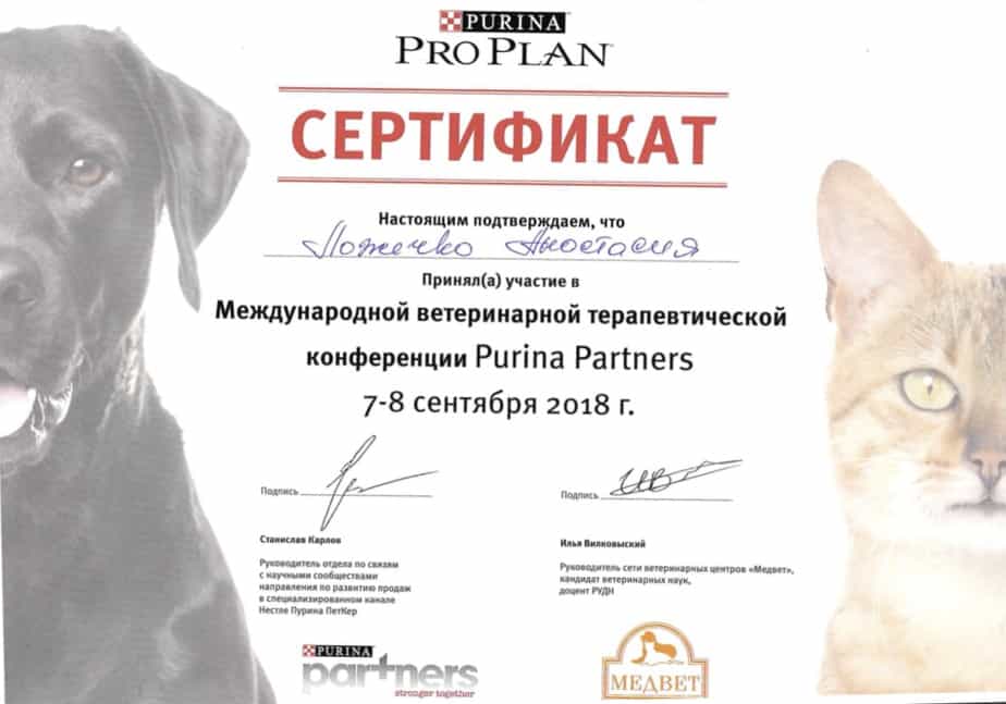 2018 г. — участие в Международной ветеринарной терапевтической конференции Purina Partners.