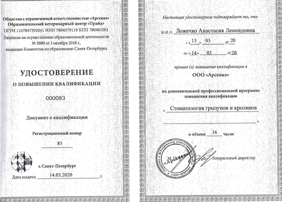 2020 г. – курсы повышения квалификации в ООО «Арсенал» по «Стоматологии грызунов и кроликов».