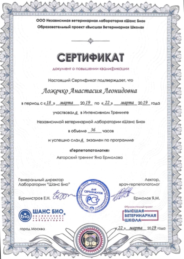 2019 г. — курсы повышения квалификации на базе Независимой ветеринарной лаборатории «Шанс Био» по теме «Герпетопатология».