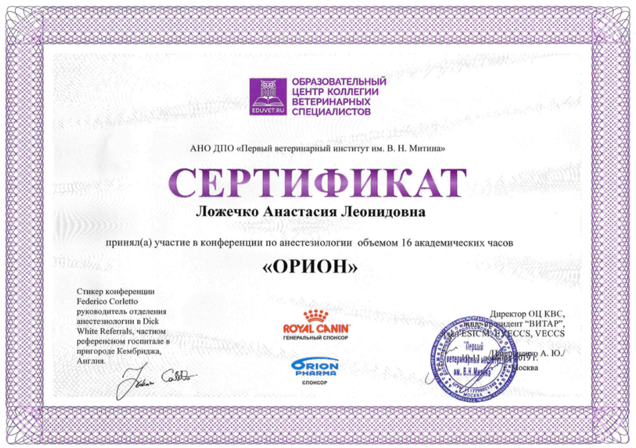 2019 г. – участие в Анестезиологической конференция ОРИОН-2019 на базе Образовательного центра коллегии ветеринарных специалистов.