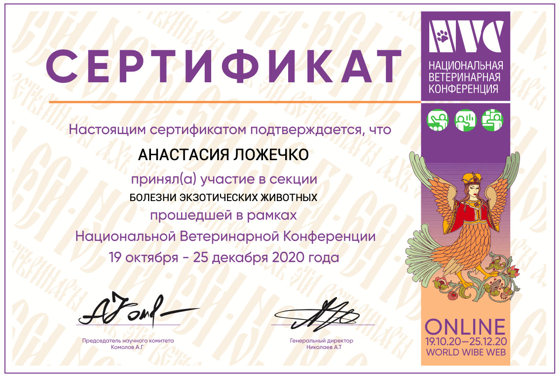 2019 г. — участие в конференции «Болезни птиц, кроликов и рептилий».