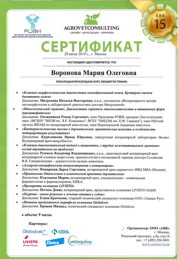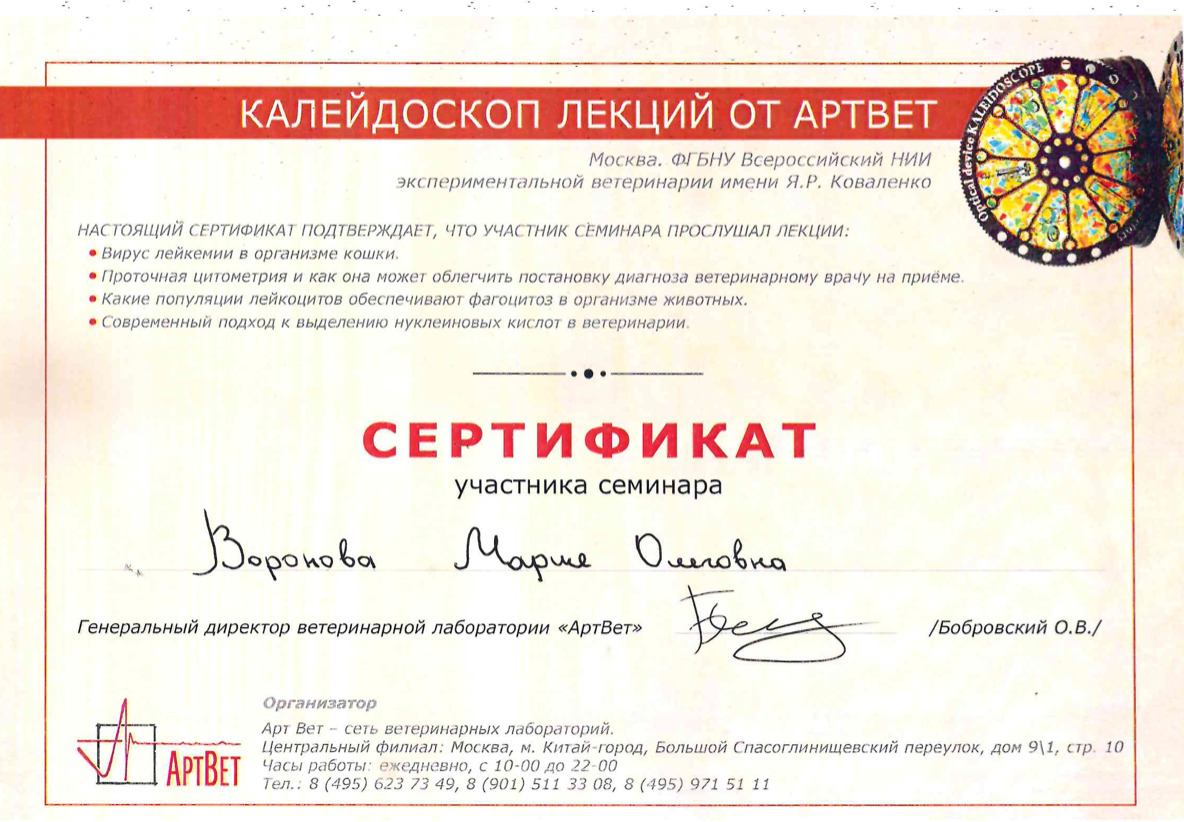 Регулярно посещает семинары и конгрессы по ветеринарии