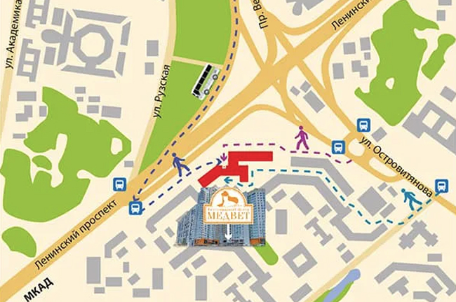 после пересечения перекрестка Миклухо-Маклая и 26-ти Бакинских Комиссаров держитесь в левом ряду. Съезд с Ленинского проспекта на мосту из левой полосы, под указатель Теплый стан, Островитянова. Далее через 200 метров первый поворот направо, между ТЦ «Галеон» и магазином SPAR и через 100 метров еще раз направо (ориентир — высотный белый дом с оранжевым цоколем). Двигайтесь вдоль дома до вывески Ветеринарный центр «МЕДВЕТ».